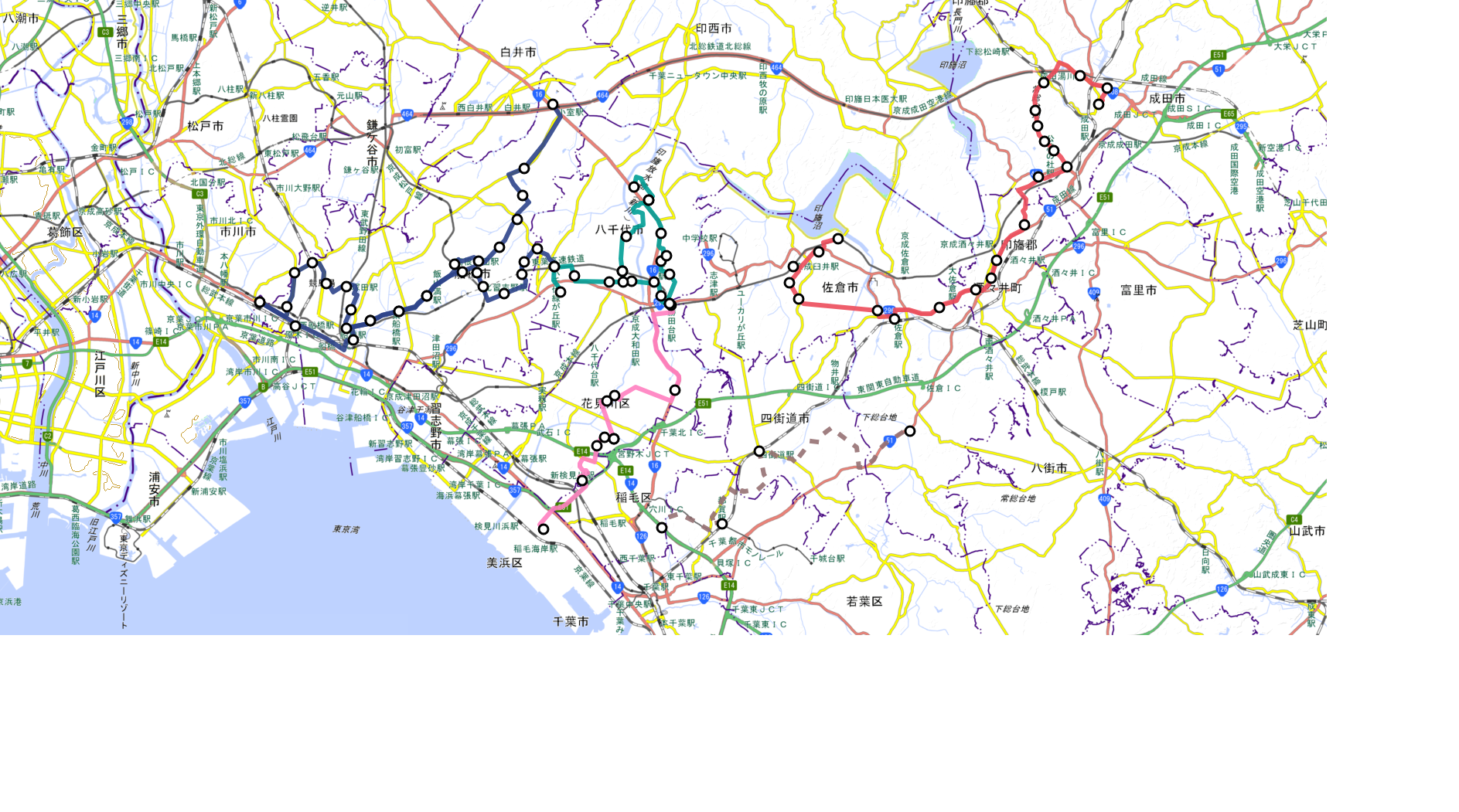 看板路線。17駅・53.5km。八丁堀〜五井を結ぶ中心線。